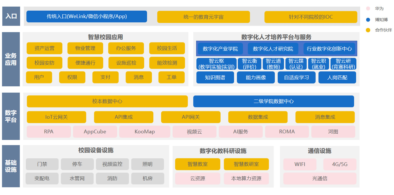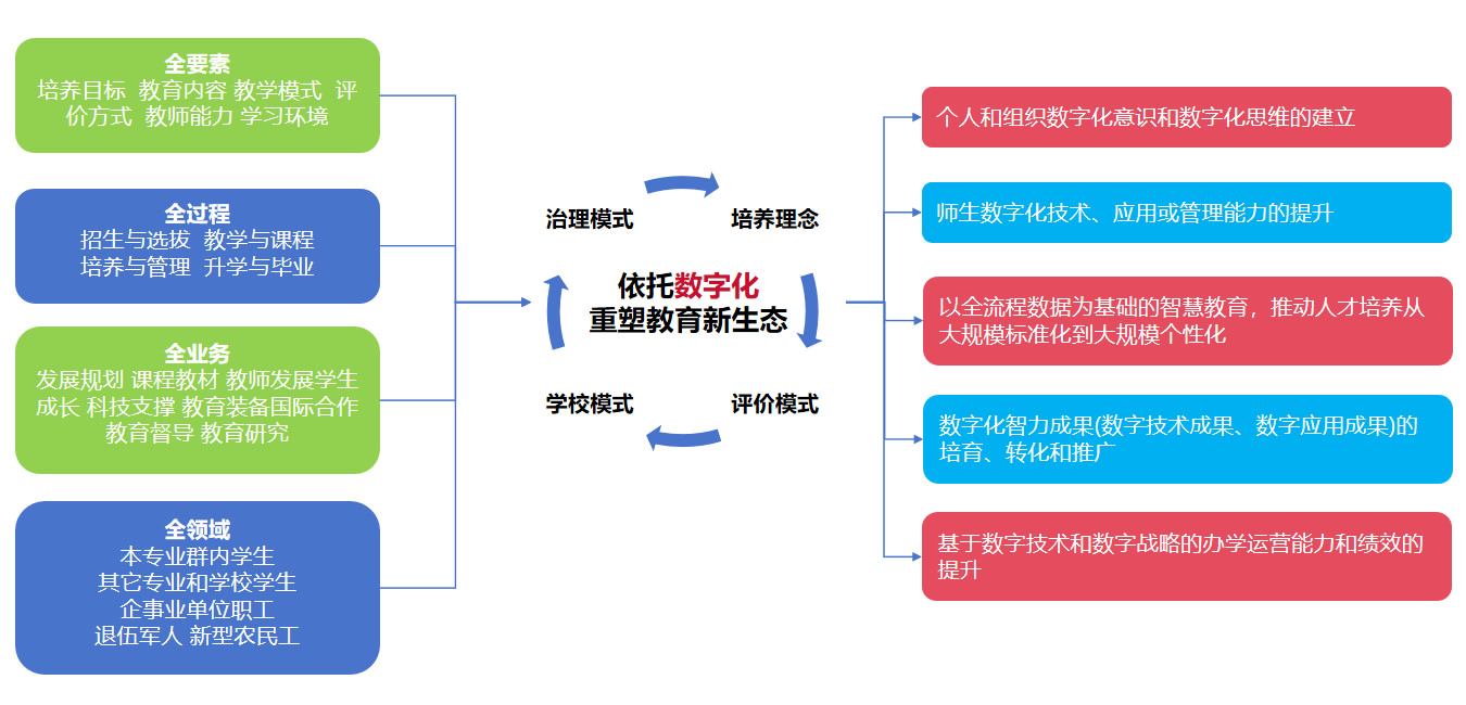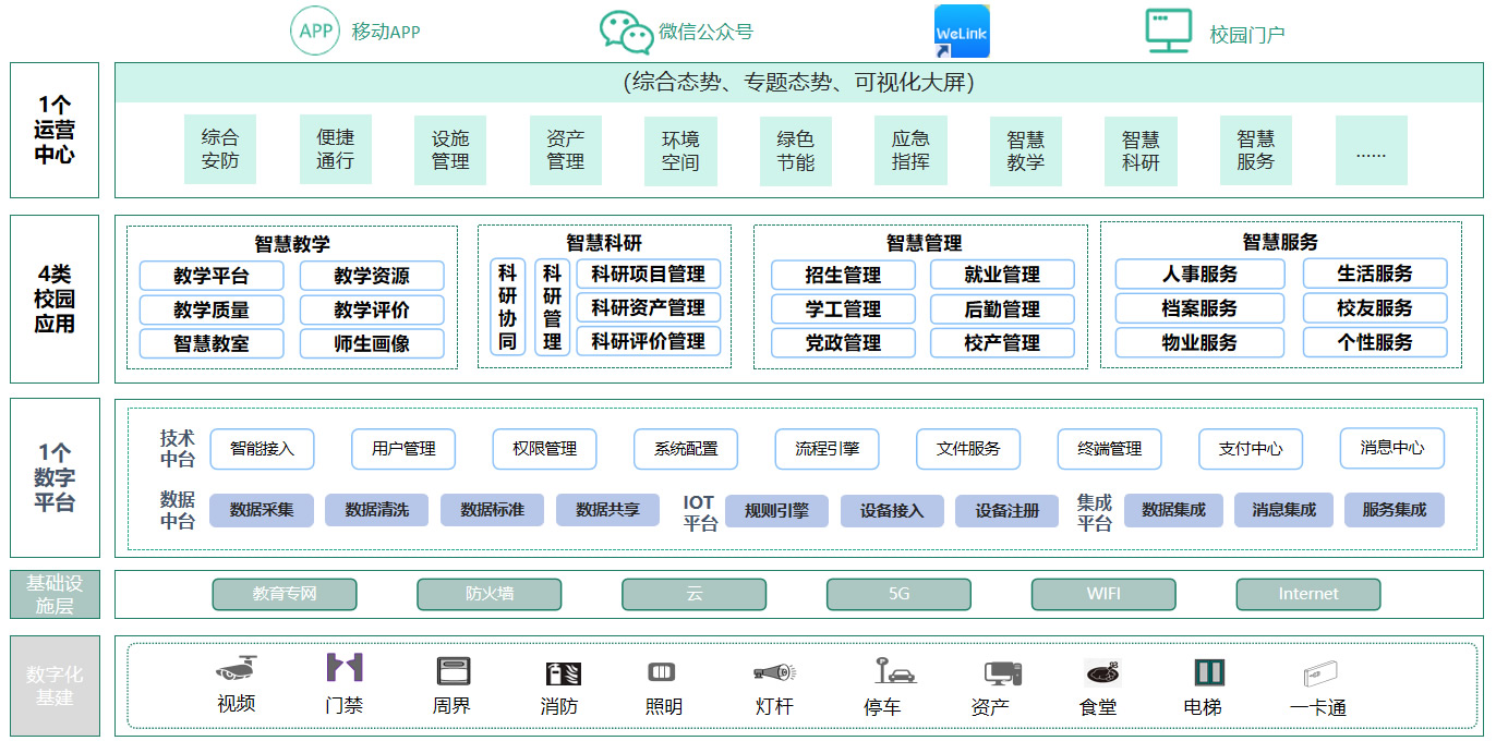 智慧教育整体架构-打造“1个数字平台+1个智能运营中心IOC++4类应用模块(教学、科研、管理、服务)+N个应用场景”的创新方案