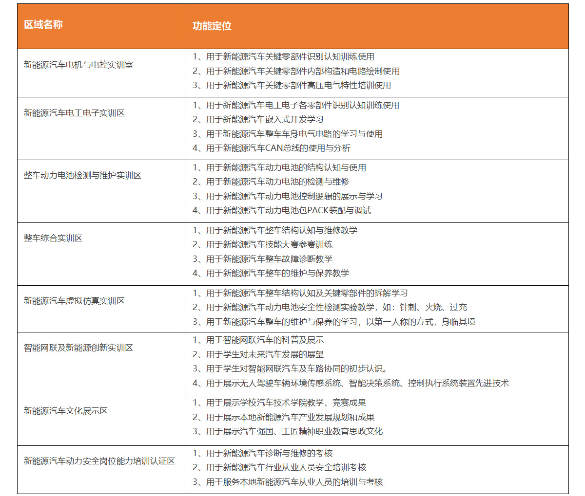 合作企业与合作院校一起,共建理实一体化的实训基地,该基地的建设,将在人才培养方案的基础上,按照理实一体化的思路来建设。本实训基地将按照新能源汽车技术的各个分支领域来建设,包括:新能源汽车电机与电控实训室、新能源汽车电工电子实训区、整车动力电池检测与维护实训区、整车综合实训区、新能源汽车虚拟仿真实训区、智能网联及新能源创新实训区、新能源汽车文化展示区、新能源汽车动力安全岗位能力培训认证区。